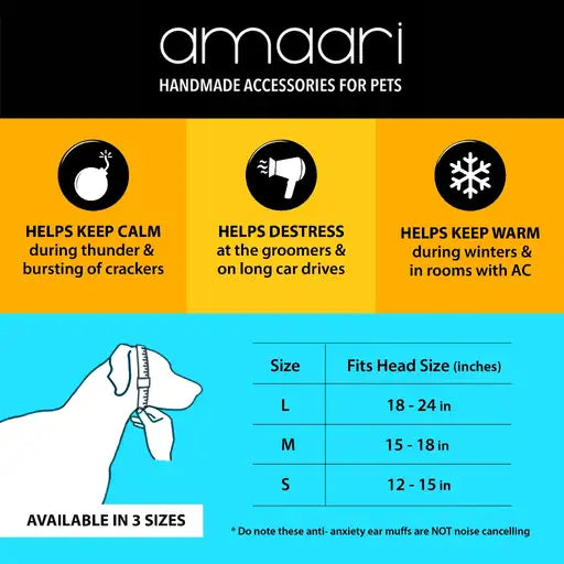 Fashion meets purpose with our anti-anxiety earmuffs that are specifically designed to calm your pets when stressed due to loud sounds like thunder, fireworks or even the noise from hair dryers at the groomers or vacuum cleaners at home.